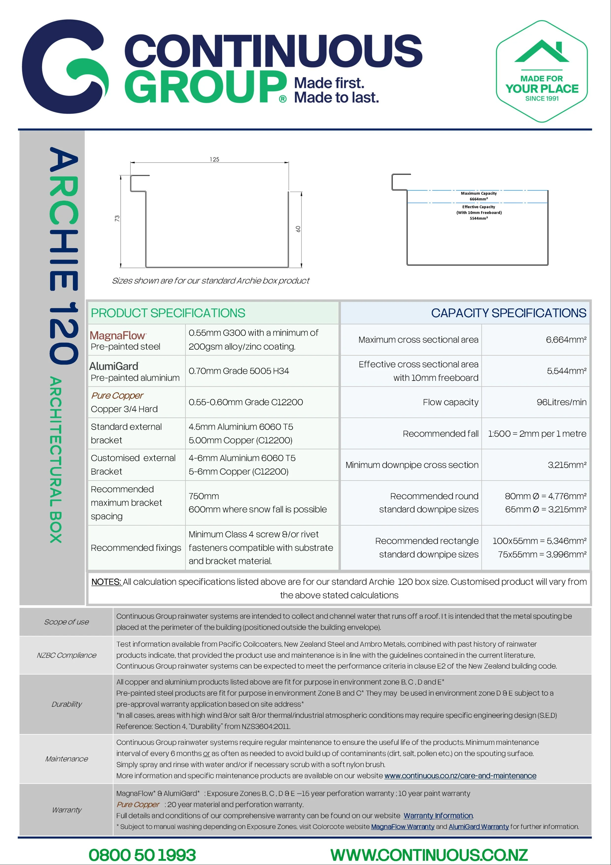 Drawings and spec shown below are for our standard Archie 120 profile. Custom sizes can be manufactured within limitations of material chosen, NZBC minimum size requirements for gutters and “Canning” tolerances.